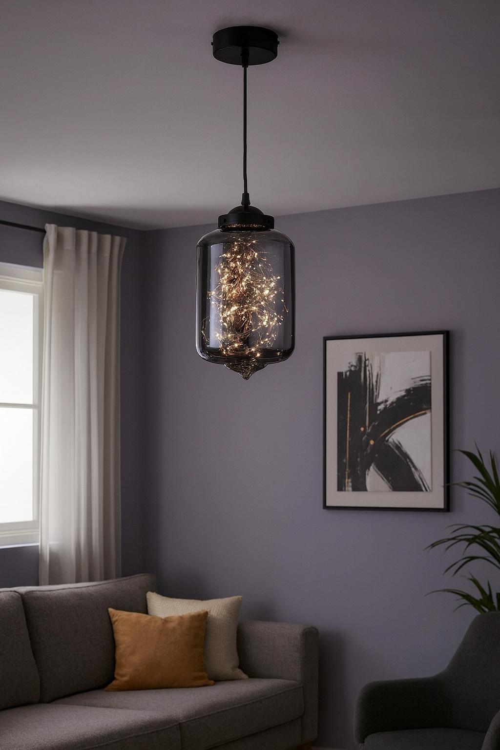 Cam gövdesi, loş ve yumuşak bir ışık yayarken, avizenin içindeki peri led teller, ışığın duvarlara ve tavana zarifçe yansımasını sağlar. Oturma odaları, yatak odaları, çalışma alanları veya özel köşeler için mükemmel bir tercihtir.