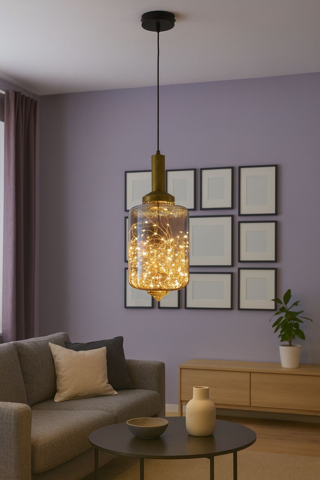 Cam gövdesi, loş ve yumuşak bir ışık yayarken, avizenin içindeki peri led teller, ışığın duvarlara ve tavana zarifçe yansımasını sağlar. Oturma odaları, yatak odaları, çalışma alanları veya özel köşeler için mükemmel bir tercihtir.