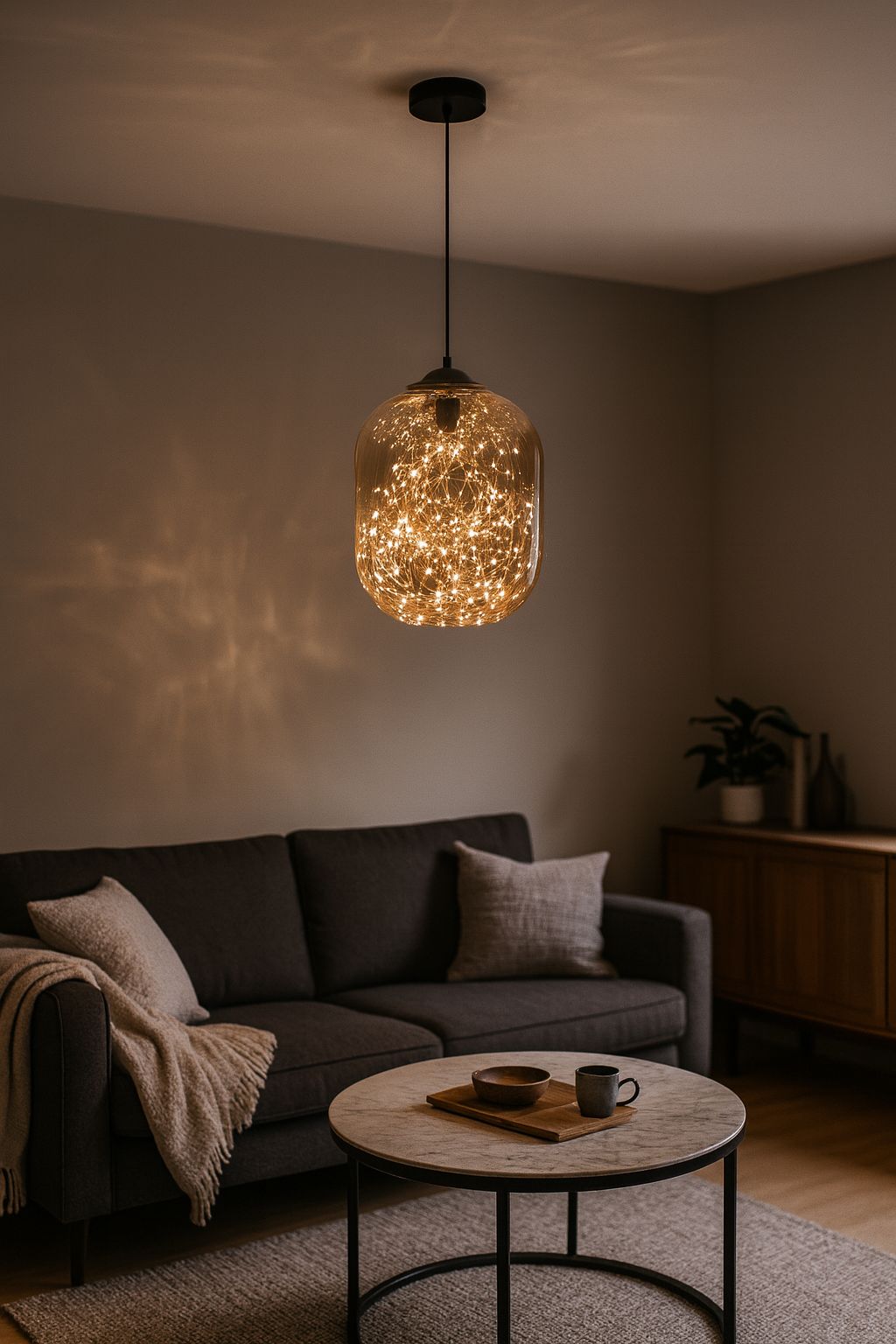 Cam gövdesi, loş ve yumuşak bir ışık yayarken, avizenin içindeki peri led teller, ışığın duvarlara ve tavana zarifçe yansımasını sağlar. Oturma odaları, yatak odaları, çalışma alanları veya özel köşeler için mükemmel bir tercihtir.
