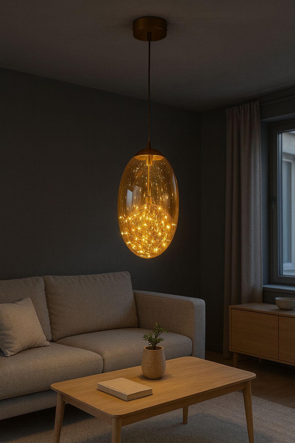 Cam gövdesi, loş ve yumuşak bir ışık yayarken, avizenin içindeki peri led teller, ışığın duvarlara ve tavana zarifçe yansımasını sağlar. Oturma odaları, yatak odaları, çalışma alanları veya özel köşeler için mükemmel bir tercihtir.
